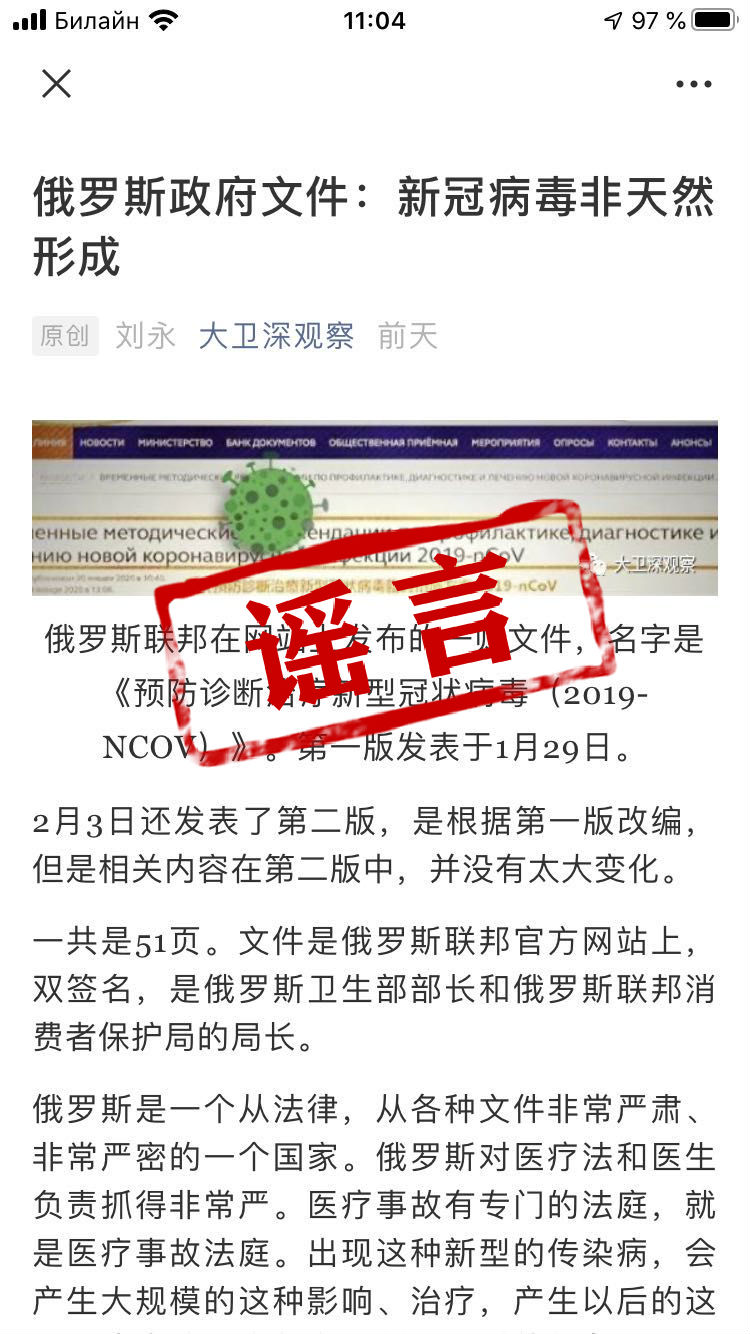 网传俄罗斯专家确定新冠病毒为人工合成纯属谣言